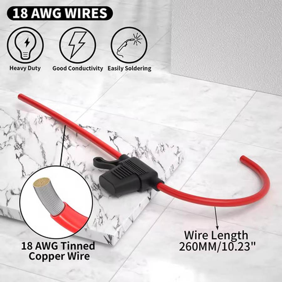 -Los cables de este portafusibles en línea de 12V tienen un diseño de 18 awg, que está estañado para mejorar su rendimiento de resistencia a la corrosión y hace que se suelde más fácilmente.